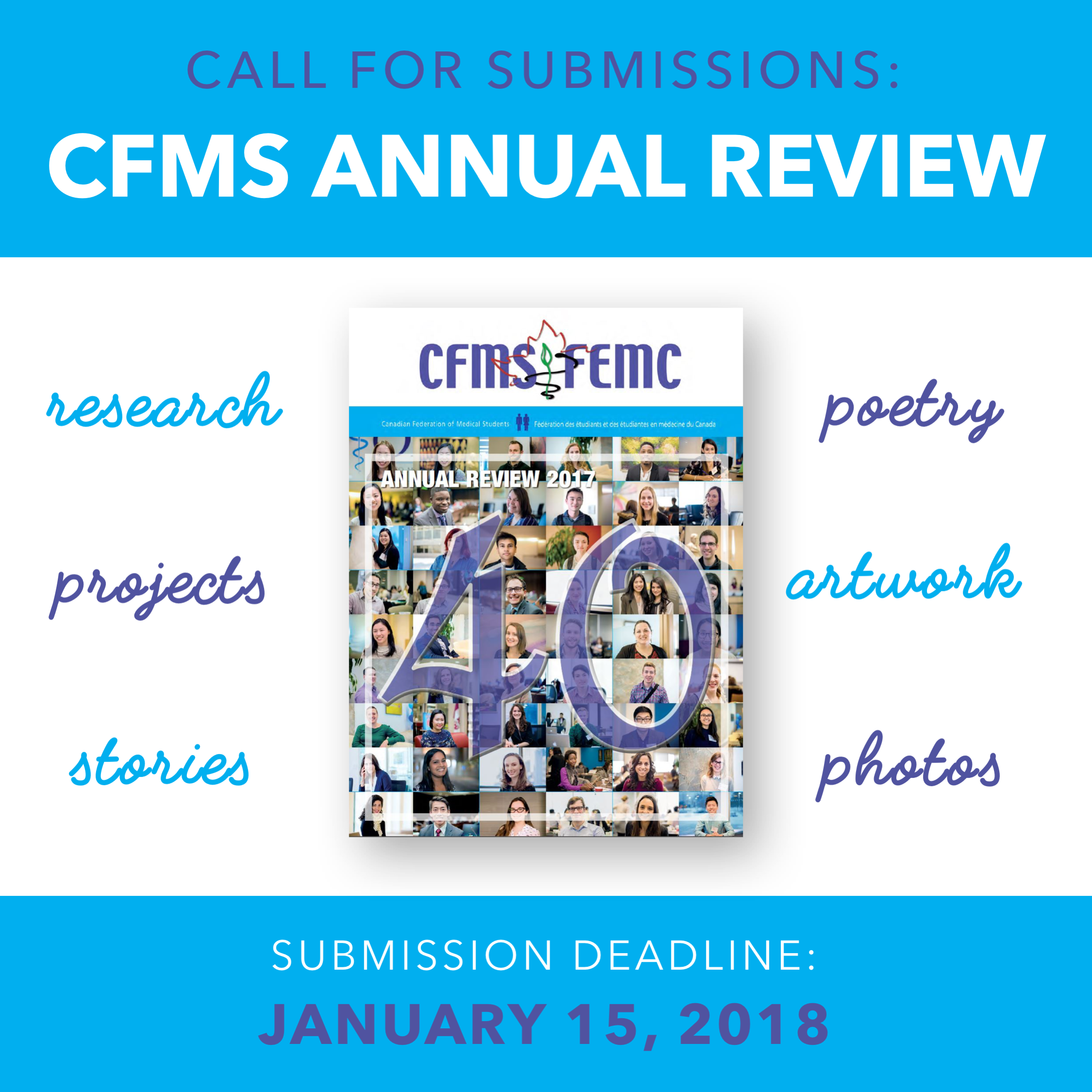Submissions of all kinds can be sent to Darwin Chan, our Annual Review editor, at annualreview@cfms.org. Submissions are due by January 15, 2018.