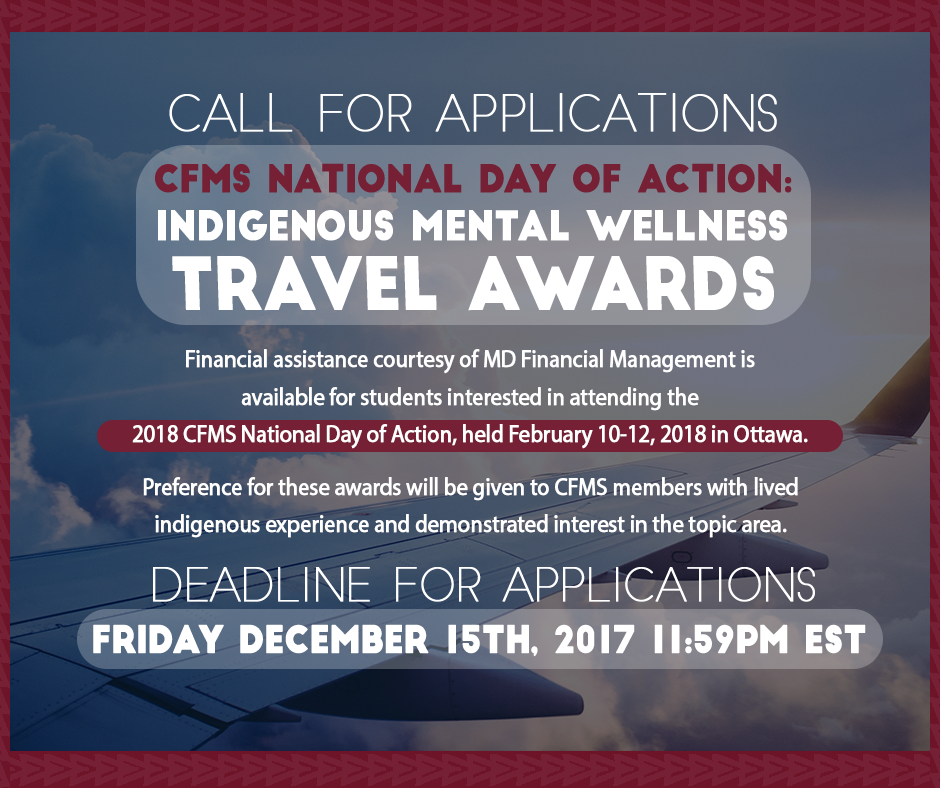 The CFMS is pleased to provide financial assistance sponsored by MD Financial Management, to students interested in attending our 2018 National Day of Action, held February 10-12, 2018 in Ottawa, Ontario. This year’s National Day of Action will be on the theme of Indigenous Mental Wellness. Further details on the Day of Action can be found here.