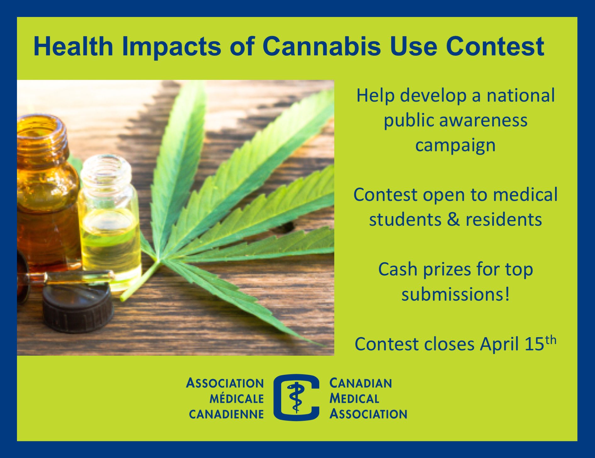 À titre d’étudiants en médecine et de futurs médecins, vous êtes invités à vous servir de votre expérience analytique et de votre côté créatif pour nous soumettre vos idées concernant les méfaits potentiels de la consommation de cannabis ainsi que les mises en garde que vous souhaiteriez faire à ce sujet. Des prix en espèces seront remis pour les meilleures idées! Pour en savoir plus, consultez la page amc.ca/concourscannabis.