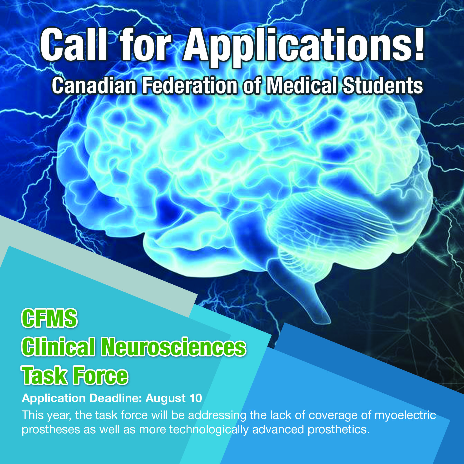 This year, the task force will be addressing the lack of coverage of myoelectric prostheses as well as more technologically advanced prosthetics. These devices are sold for tens of thousands of dollars, often crippling middle-class families attempting to purchase these. While advances in the field of prosthesis and neuroprosthesis are made, the foundations for providing even low-grade care are not laid—health care and insurance coverage for these devices is extremely poor. As advances are made, we are helping lay the foundations to be built upon, allowing people access to life-changing care. This task force will also be planning an approach to Clinical Neuroscience-related issues across Canada and undertaking these initiatives.