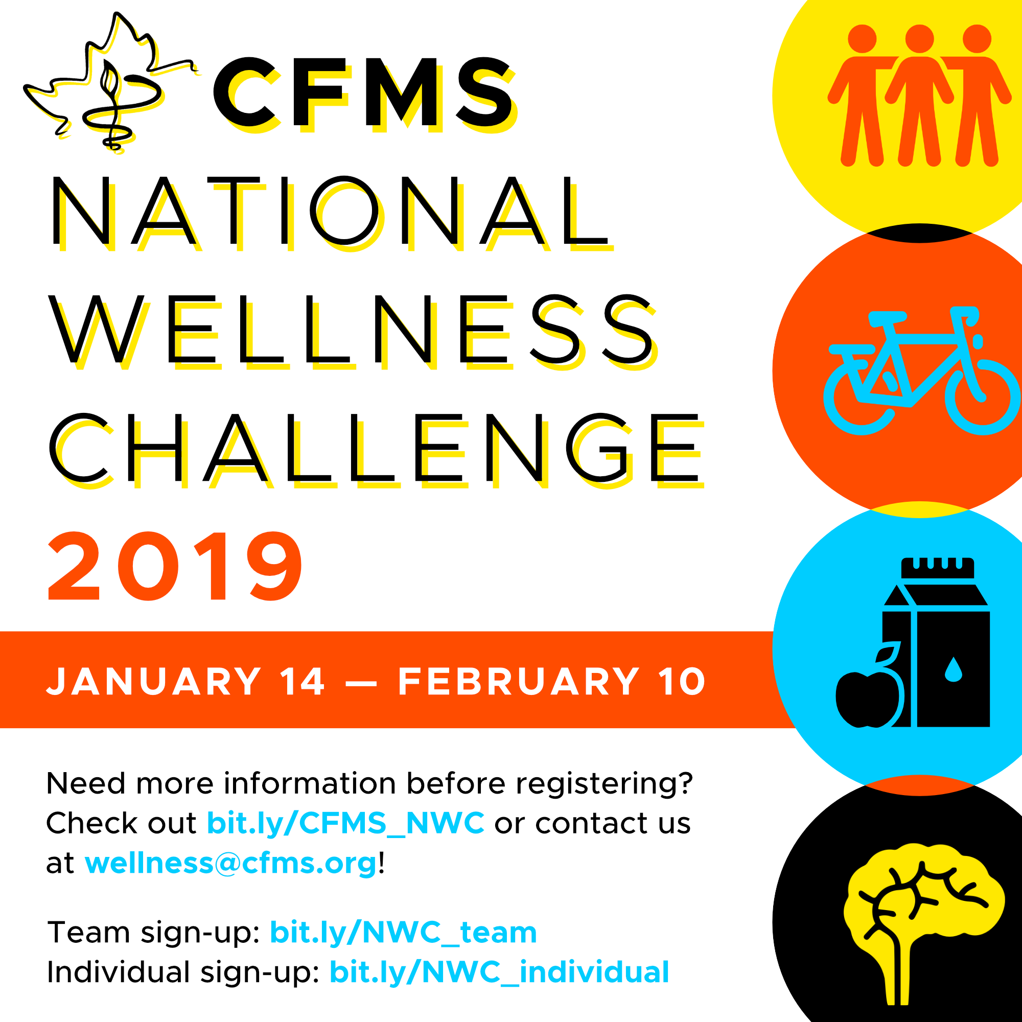 The CFMS is an organization representing over 8,000 medical students from 15 Canadian medical student societies from coast to coast. We represent medical students to the public, to the federal government, and to national and international medical organizations.Call for Registration: National Wellness Challenge 2019 (Starts on Jan. 14)