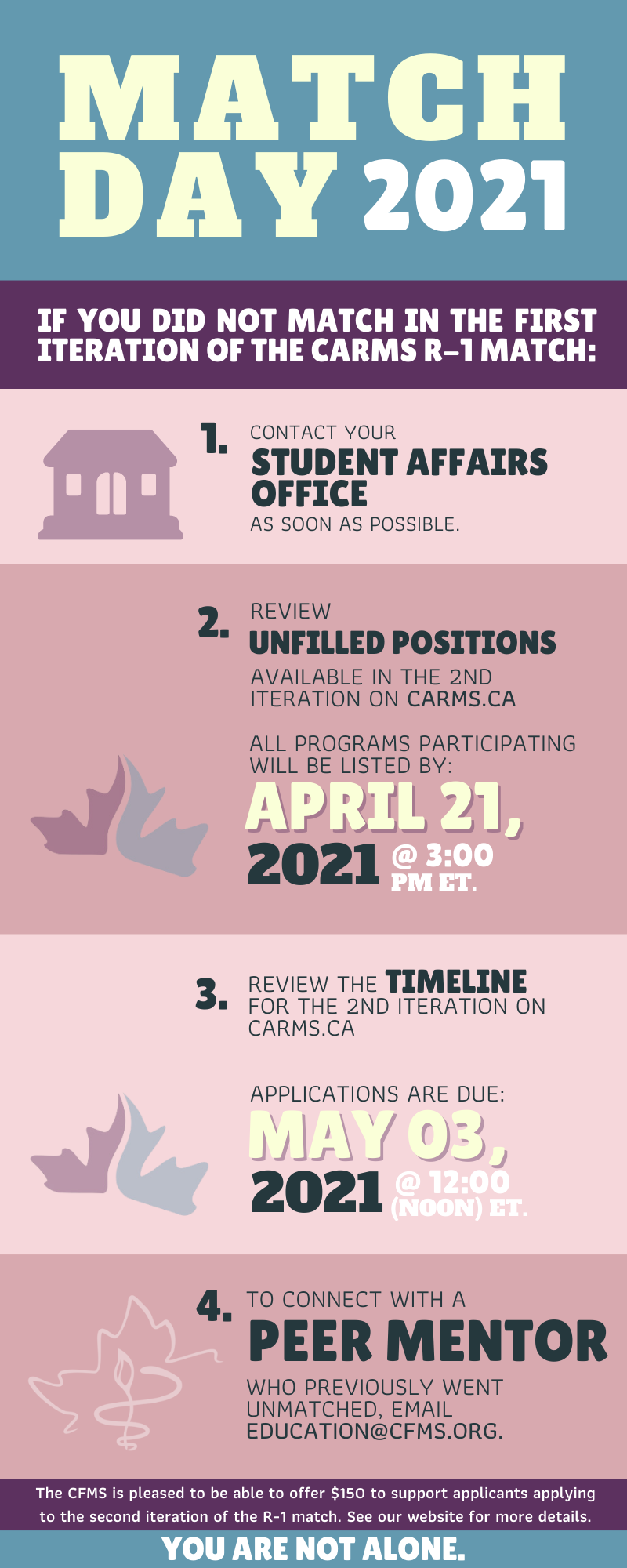 3) Second Iteration Application Reimbursement: The CFMS is excited to offer all unmatched members $150 to support applying to the second iteration of the R-1 match. The reimbursement form is available here . The reimbursement form must be completed and submitted to administrative@cfms.org by May 30th, 2021.