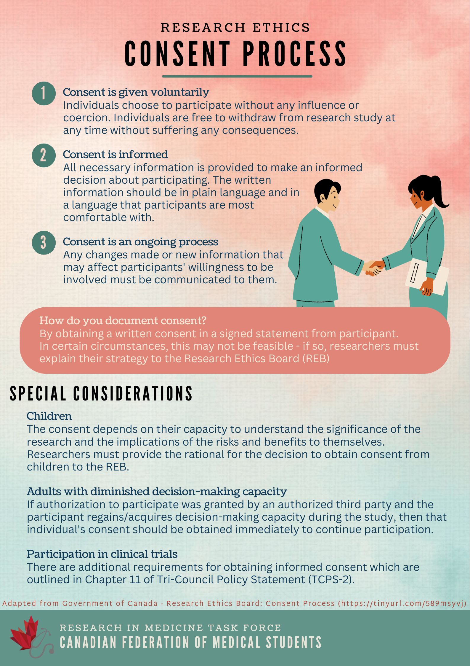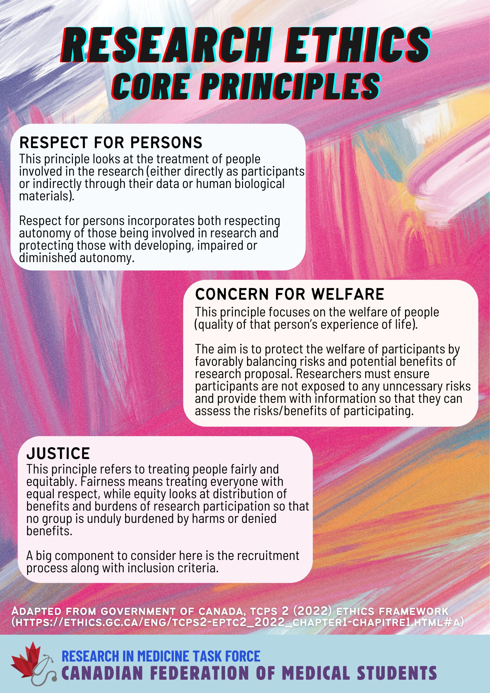 The CFMS Research Portfolio has complied a template pertaining to the research ethics review process. While not comprehensive, this template provides students with an overview of the typical elements examined in a review of ethical considerations for research involving humans. Further, students who wish to conduct a research project in affiliation with the CFMS are asked to complete this form and submit it to the CFMS Board as part of their request.