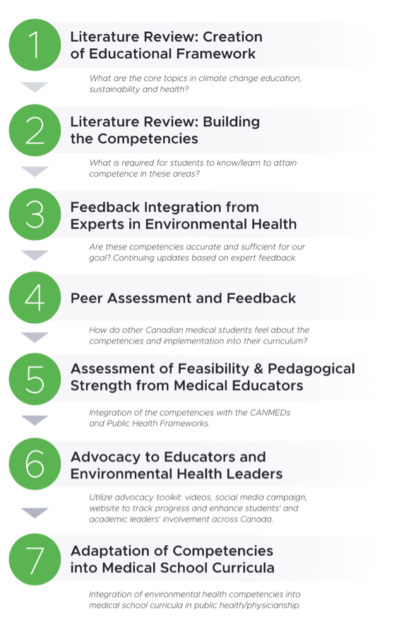 The Planetary Health Curricular Competencies (last updated in 2021) are available here. The development process for the competencies is outlined in the infographic below, with the competencies having been modeled after the MCC competencies all Canadian medical schools must teach in order to receive accreditation and the CanMEDS roles for physicians.