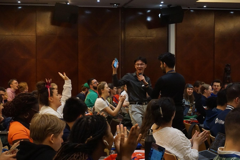 Jun Kim doing roll call for CFMS Canada during a plenary session